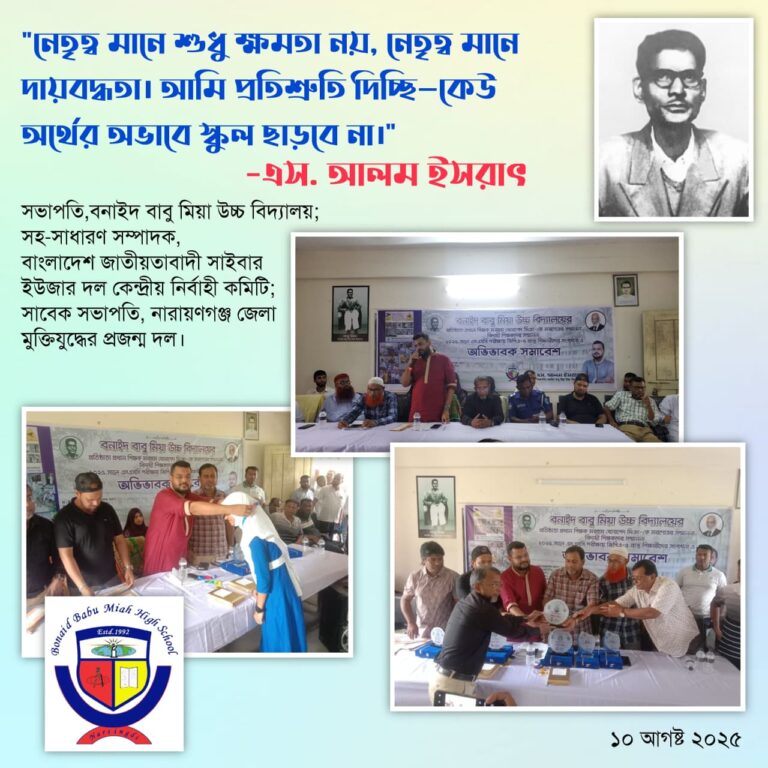 Bonaid Babu Mia High School is the official name of the academic institute, as registered with the education authorities. The native or alternative name of the institute is বনাইদ বাবু মিয়া উচ্চ বিদ্যালয়, often used in local Bengali language contexts. The unique Educational Institute Identification Number (EIIN) assigned to this institute is 112690, provided by the Directorate of Secondary and Higher Education. The institute was established on 13 November, 1992, marking the beginning of its educational journey. The institute is officially recognized by the relevant authorities as Recognized. The institute received official recognition on 01 January, 1994. It is recognized at the Secondary, indicating the level or grade of approval. The institute is included in the Monthly Pay Order (MPO) system at the Yes, determining government funding for teachers’ salaries. The official registration number for the institute’s inclusion in the MPO facility is 3102151301.
